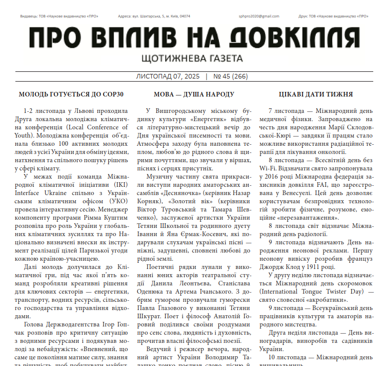 Вийшов друком 266 випуск газети «Про вплив на довкілля»