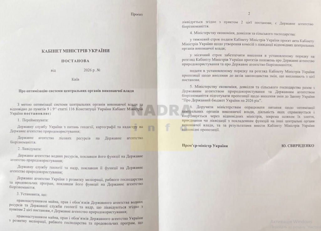 Текст [імовірно, робочої версії] документу, із копією якого вдалося ознайомитися NADRA.INFO, передбачає створення Державного агентства природокористування шляхом перейменування Державної служби України з питань геодезії, картографії та кадастру (Держгеокадастр) із покладенням на нього функцій Держгеонадр і Держводагентства (Державного агентства водних ресурсів, його також автори проєкту пропонують ліквідувати):