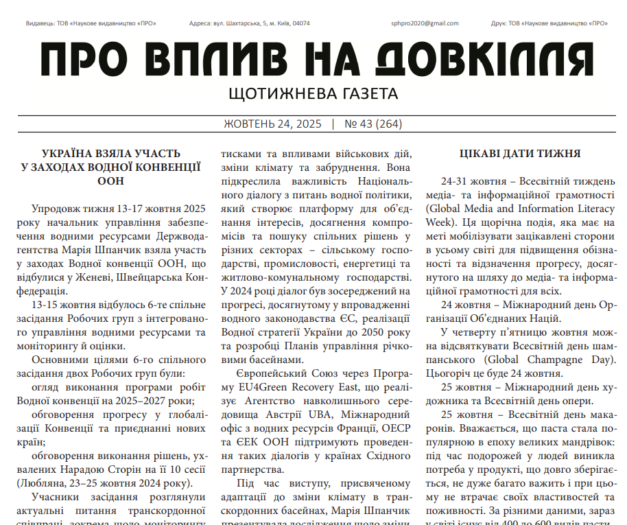 Газета «ПРО ВПЛИВ НА ДОВКІЛЛЯ» є щотижневим всеукраїнським виданням, територія розповсюдження якого охоплює всю Україну. І тому публікація повідомлення і оголошень щодо оцінки впливу на довкілля відповідає вимогам статті 4 Закону України «Про оцінку впливу на довкілля».