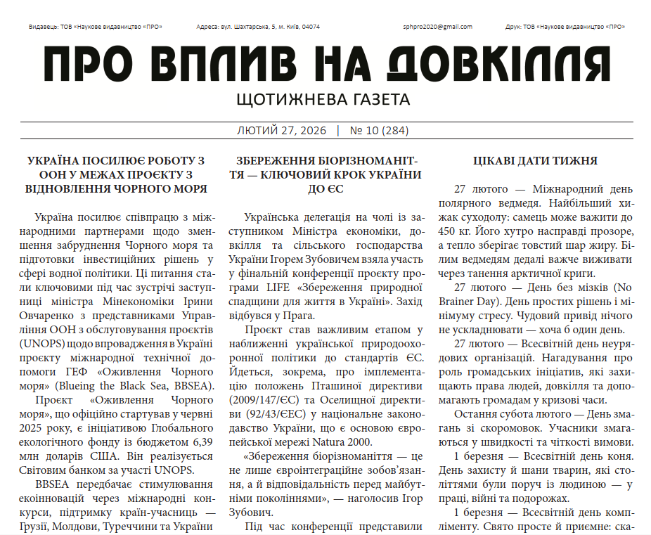 Газета «Про вплив на довкілля» продовжує інформувати про ключові рішення, події та тенденції у сфері екологічної політики, надрокористування та сталого розвитку.